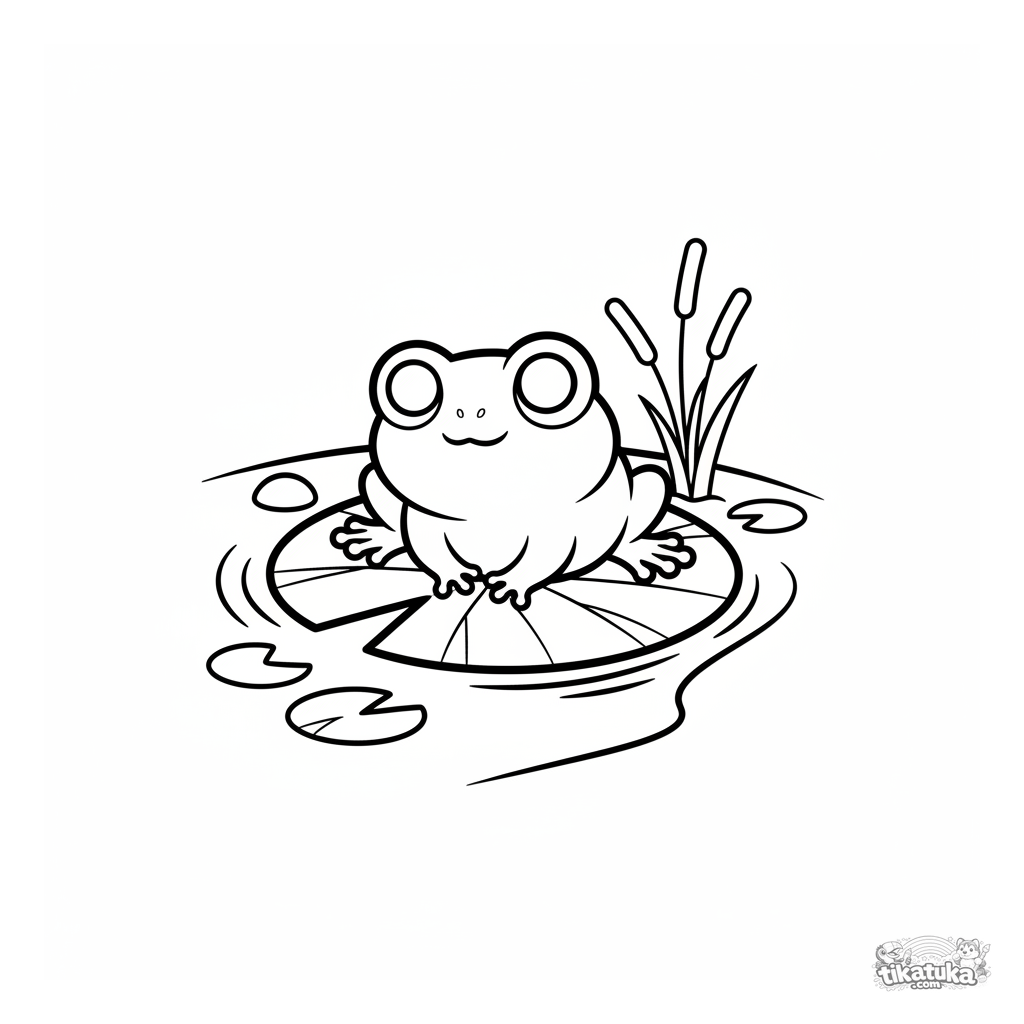 Simple coloring page for toddlers 2-3: a cute tiny frog sunbathing on a lily pad by a stream. Large shapes, few details, perfect for first crayons.