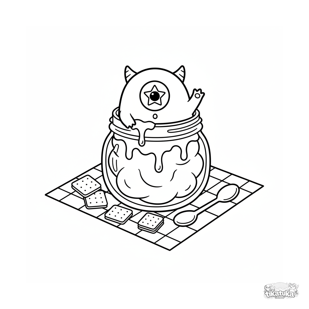 Coloring page for kids 4-6: a tiny monster with a star eye hiding in a jelly jar at a picnic. A fun scene of discovery and surprise.