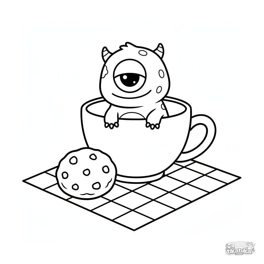 Very simple coloring page for toddlers 2-3: a tiny monster peeks out from a big teacup at a picnic. Large, clear shapes, minimal details.