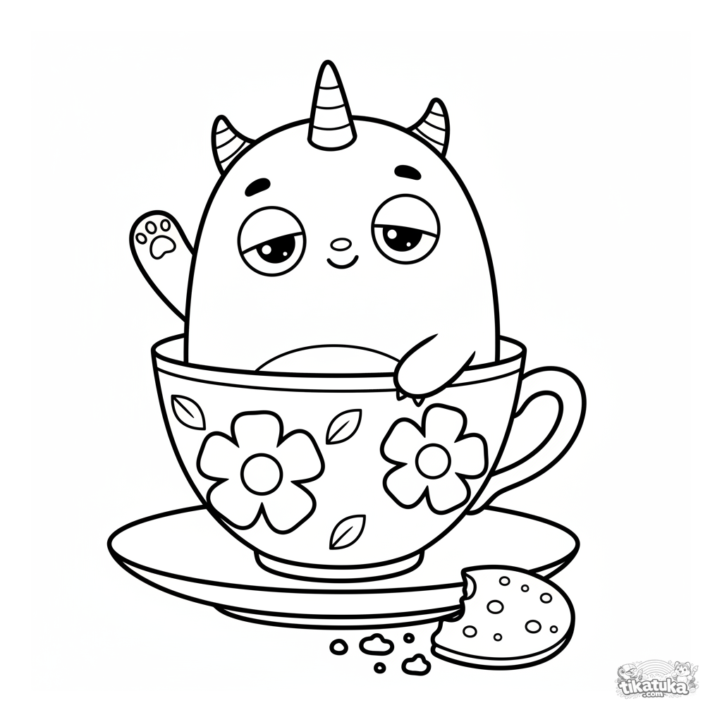 Simple toddler coloring page: a tiny one-horned monster waves from a teacup, surrounded by cookie crumbs. Large shapes and wide margins for easy coloring.