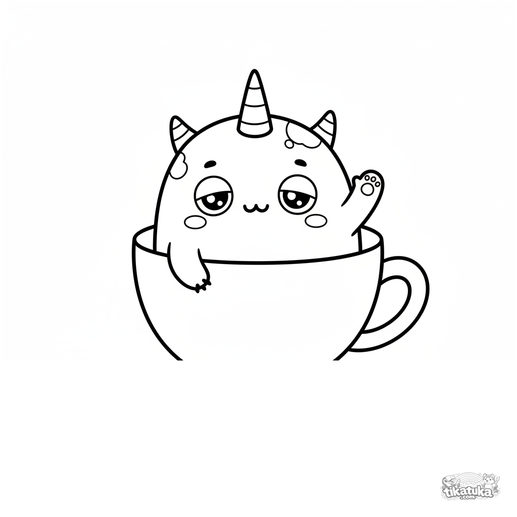 Simple coloring page for toddlers 2-3: a tiny monster with one horn waving from a teacup in a mini kitchen. Large shapes and wide margins for first crayons.