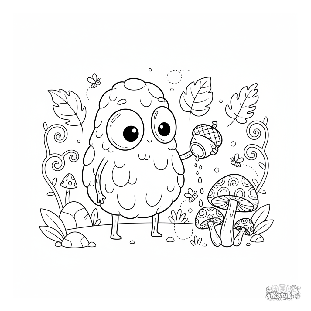 Coloring page of a moss golem in an enchanted forest. For kids 4-6. Friendly creature watering glowing mushrooms in a magical forest clearing.