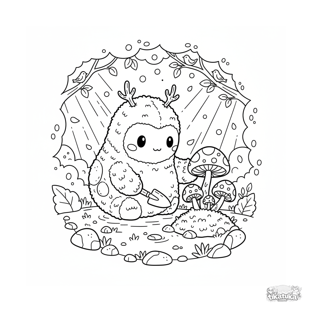 Coloring page for kids 4-6: a moss golem tends to glowing mushrooms in an enchanted forest. A cute fantasy scene for creative coloring.