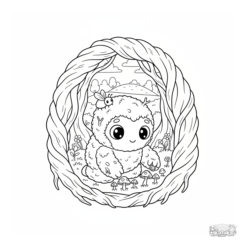 Coloring page of a moss golem tending glowing mushrooms in a cave formed by ancient tree roots. For kids 4-6, sparks imagination.