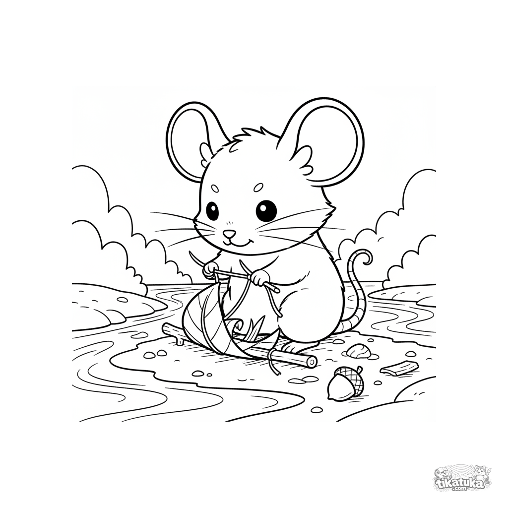 Coloring page for kids 7-9 in chibi style: a tiny mouse builds a leaf boat on a stream bank. A funny and inventive scene.