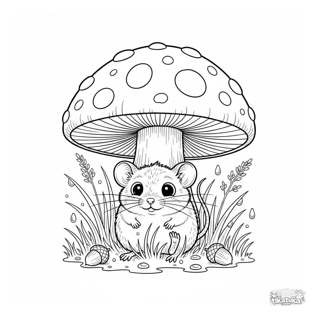 Coloring page of a mouse in nature. For kids 4-6 years old. A tiny field mouse peeks from under a giant mushroom cap after a rain, surrounded by dewdrops and acorns.