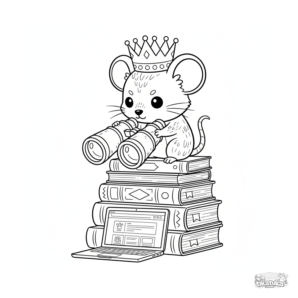 Coloring page for kids 10-12: a tiny mouse in a paper crown on a book fort with giant binoculars, looking at a laptop. Funny scene in chibi style.