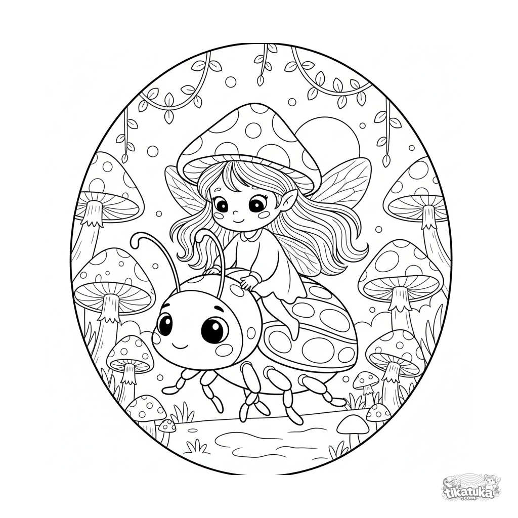 Coloring page for kids 4-6: a tiny mushroom-cap fairy riding a large glow beetle through a twilight enchanted forest.
