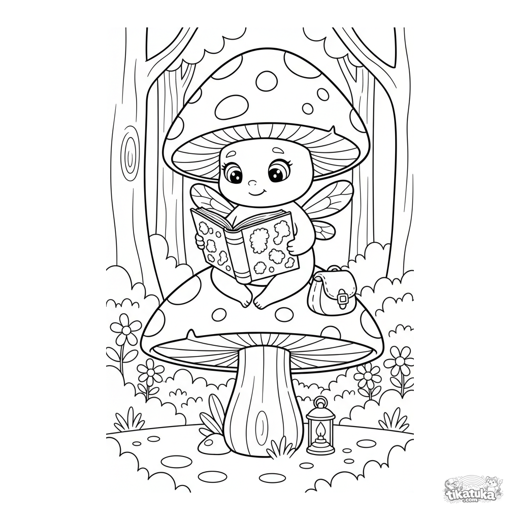 Coloring page for kids 4-6: a mushroom sprite reads a book made of glowing moss in an enchanted forest. A cute fantasy scene to spark imagination.