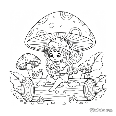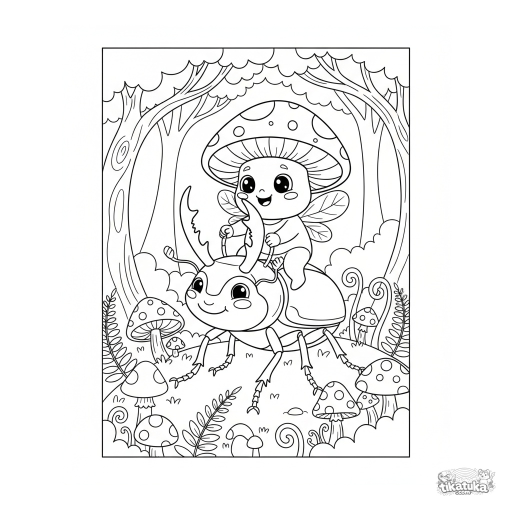 Coloring page for kids 4-6: a mushroom sprite rides a giant stag beetle through a magical forest filled with glowing toadstools and ferns.