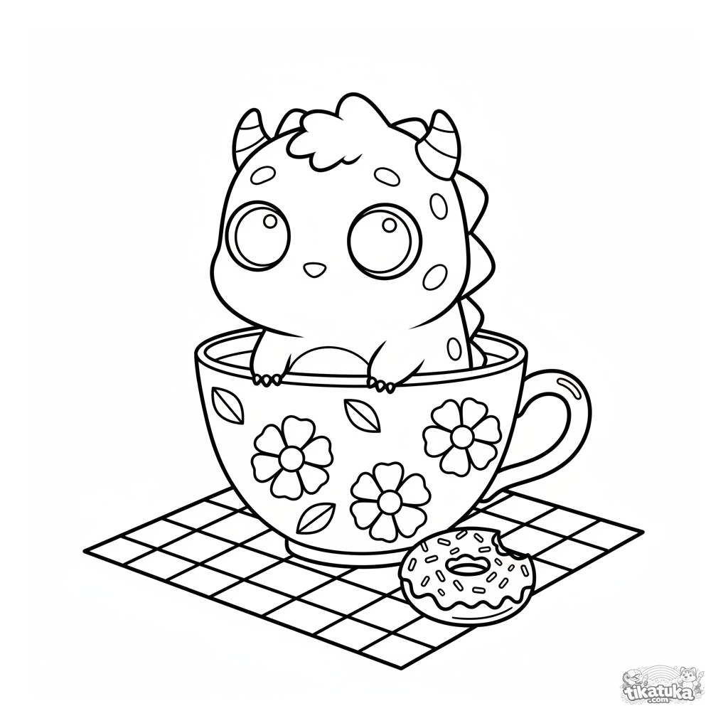 Coloring page for kids 4-6: a tiny spiky monster peeking from a teacup at a picnic. Cute anime-chibi style, simple scene.