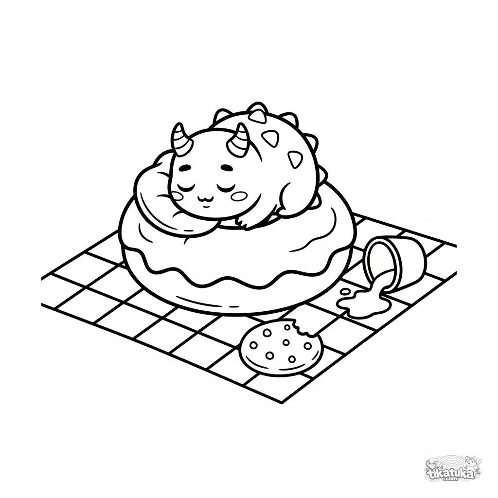 Simple coloring page for toddlers 2-3: a tiny, spiky monster is fast asleep on a giant jelly donut at a picnic. Large shapes, few details.