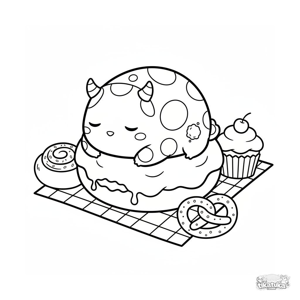 Simple coloring page for toddlers: a tiny spotted monster napping on a big jelly donut at a picnic. Large shapes, few details, for kids 2-3 years old.