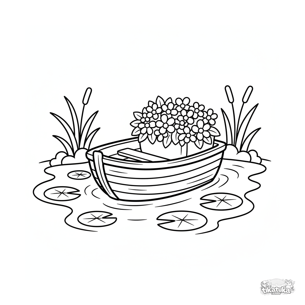 Toddler coloring page: a tiny wooden rowboat with a flower box floats on a calm village pond. Simple shapes, wide margins.
