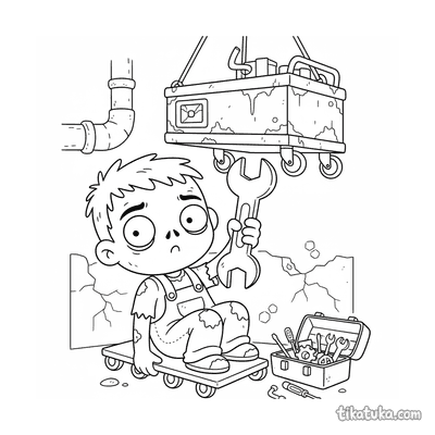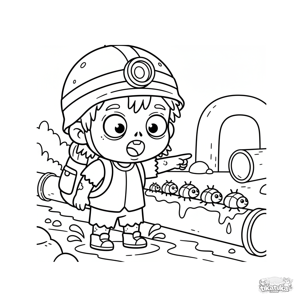 Simple coloring page for toddlers 2-3: a tiny zombie explorer with a backpack in a sewer tunnel. Large shapes, few details.