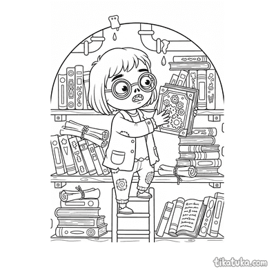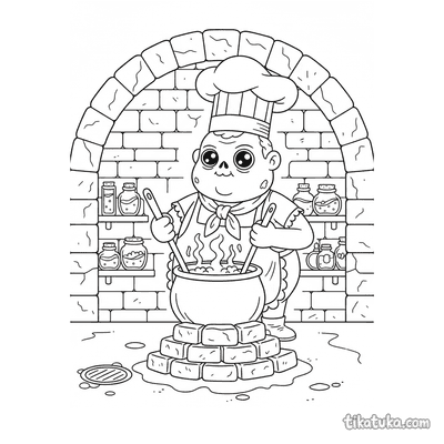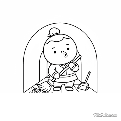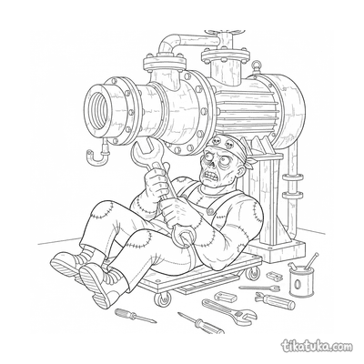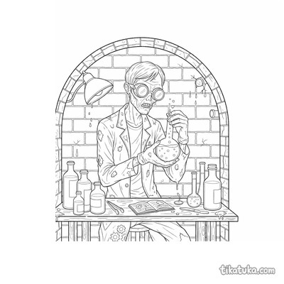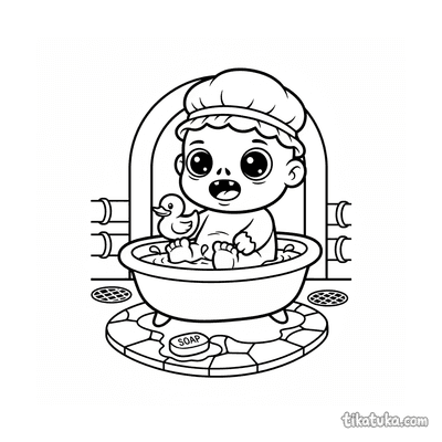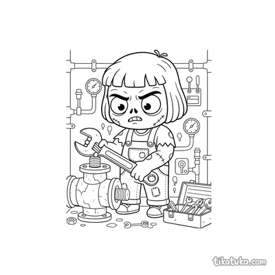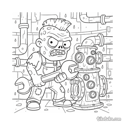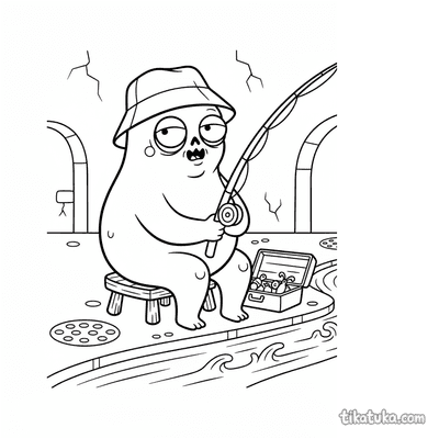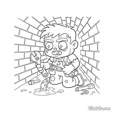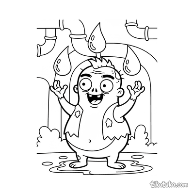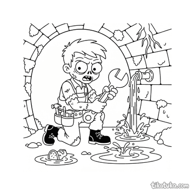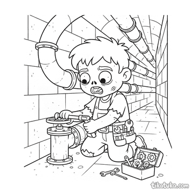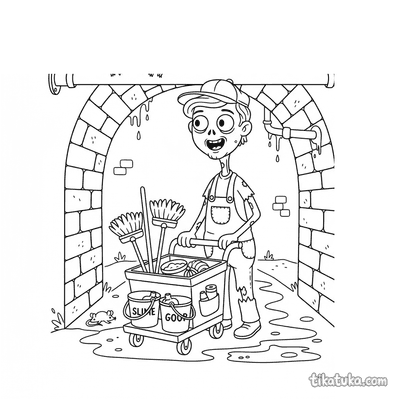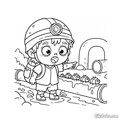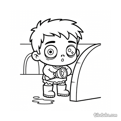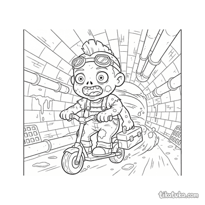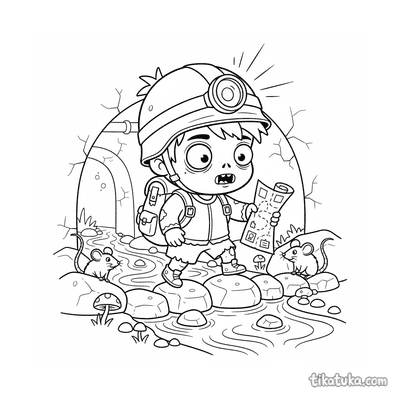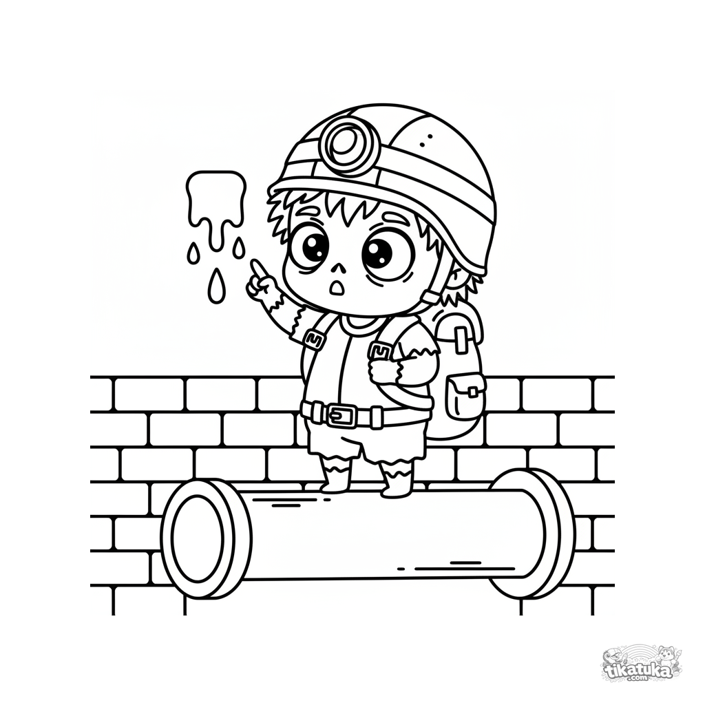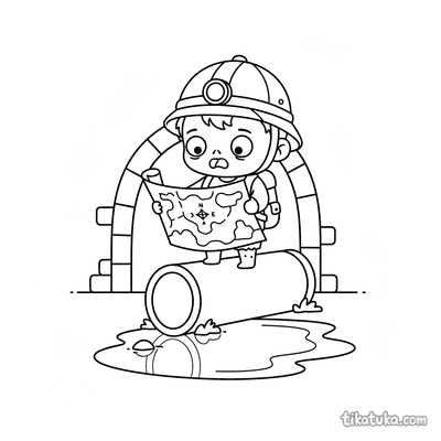 Simple coloring page for toddlers 2-3: a tiny zombie explorer in a sewer tunnel. Large shapes, minimal details.