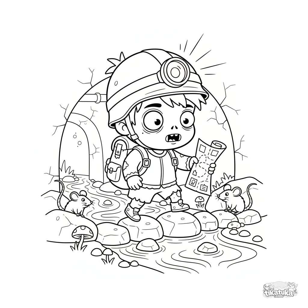 Coloring page of a cute zombie explorer crossing a stream in a sewer tunnel. For kids 4-6 years old. Simple shapes and a friendly character.