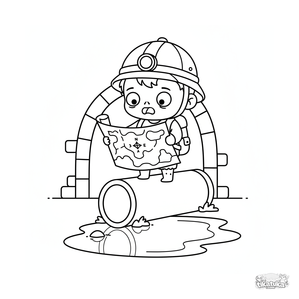 Simple coloring page for toddlers: a tiny zombie explorer with a map in a sewer. Large shapes, few details, wide margins for coloring.