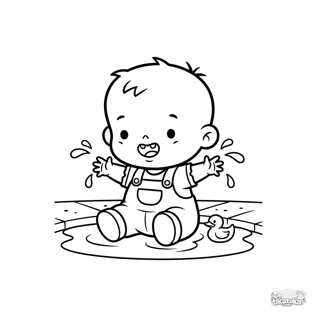 Simple coloring page for toddlers 2-3 years old: a tiny zombie in overalls happily splashing in a puddle inside a large sewer collector. Large shapes, wide margins.