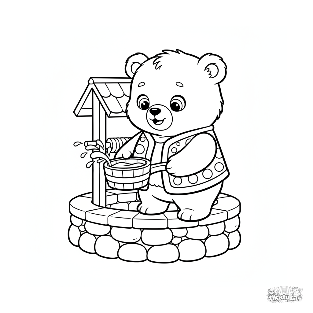 Very simple coloring page for toddlers 2-3: a cute bear cub at the well examines a dipper of water. Large shapes, thick outlines.