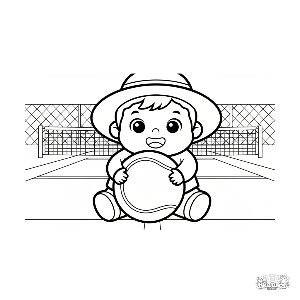 Coloring page for toddlers 2-3 years: a happy child hugging a giant tennis ball on court. Huge simple shapes and minimal details for the very young.