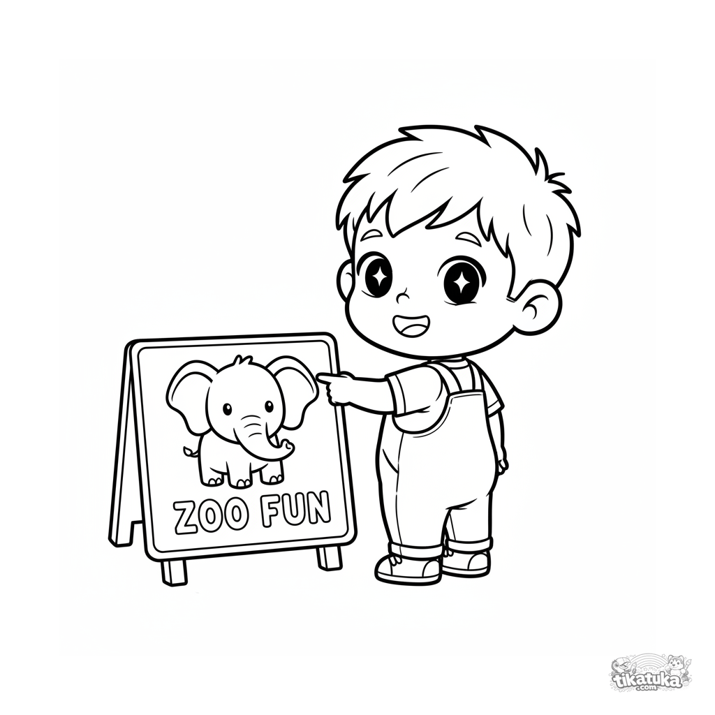 Simple coloring page for toddlers 2-3: a boy points at a big elephant picture on a zoo sign. Large shapes and clear outlines.