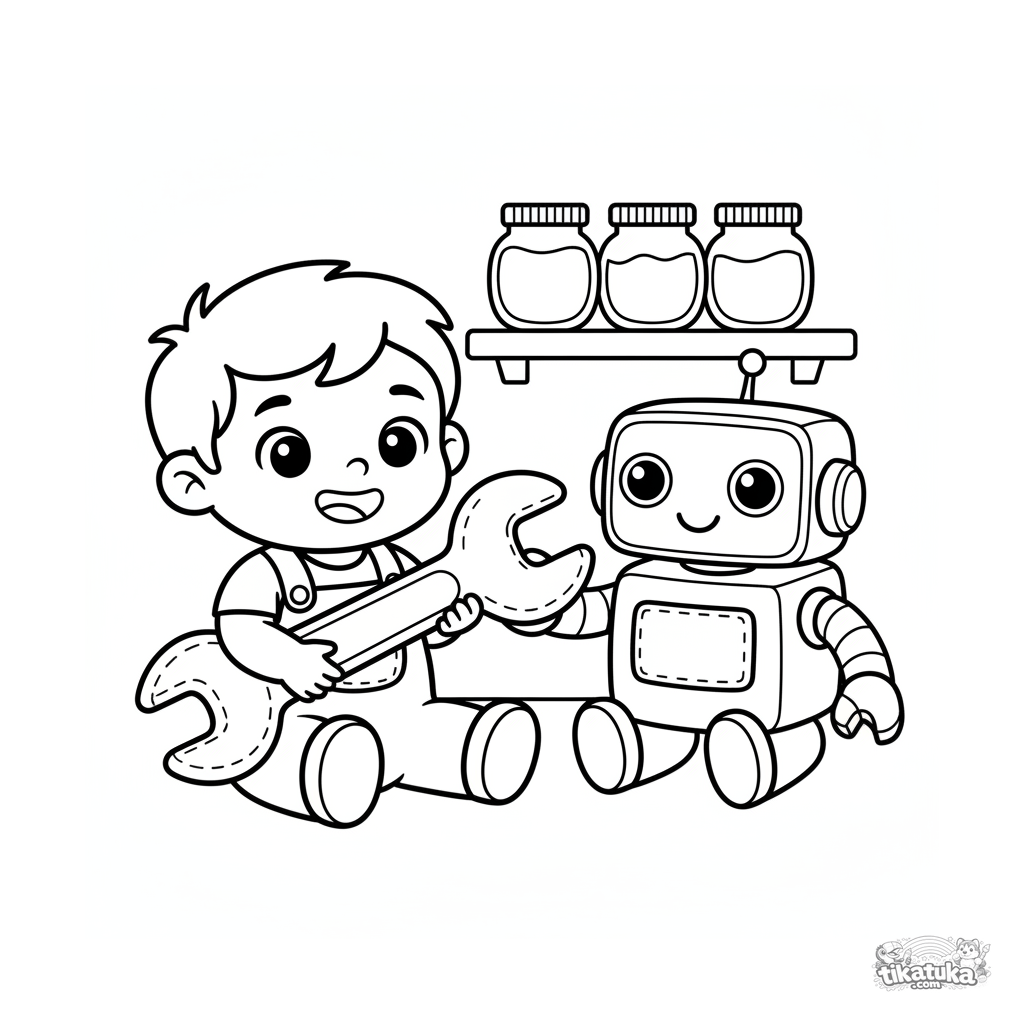 Simple coloring page for toddlers 2-3: a boy in overalls and a plush robot in a secret lab. Large shapes, wide margins.