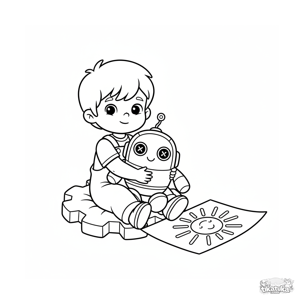 Simple coloring page for toddlers 2-3: a boy hugging a plush robot assistant in a secret inventor's lab. Large shapes and wide margins.