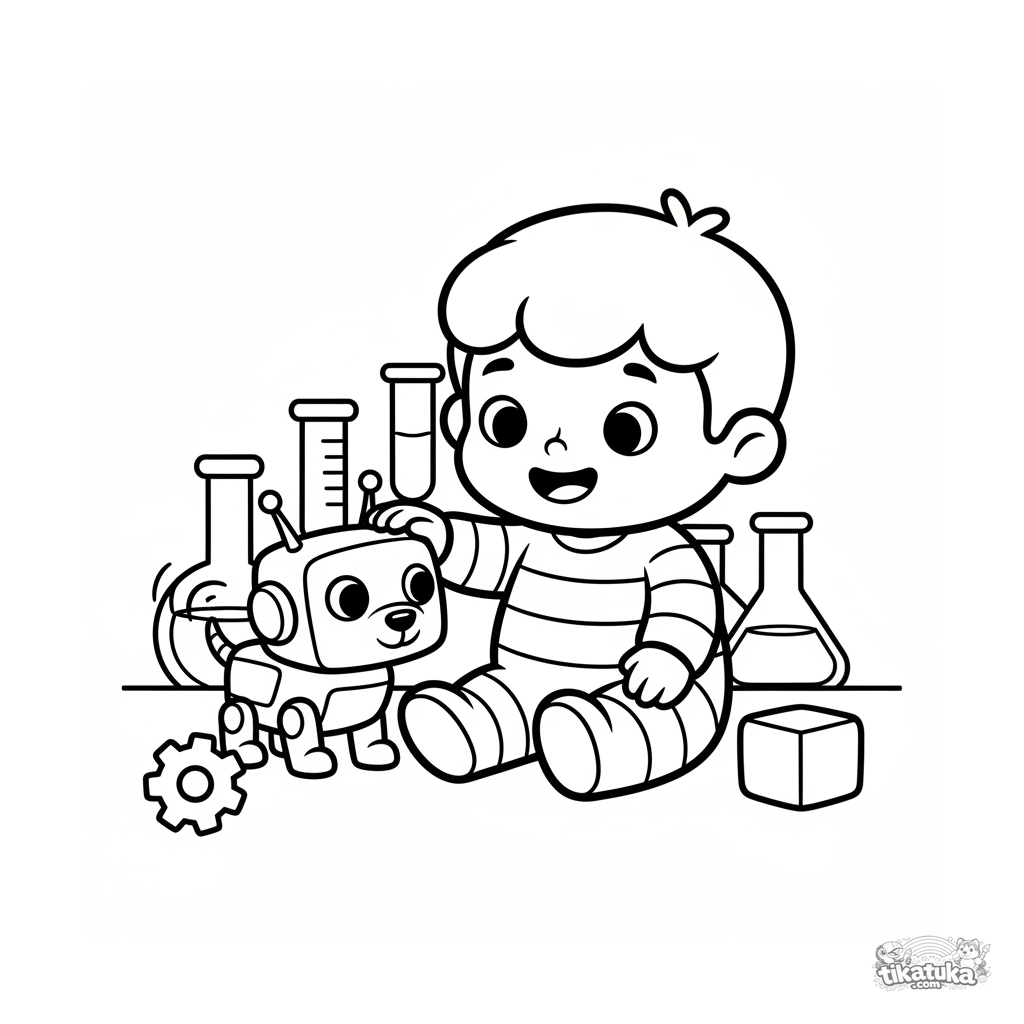 Coloring page for toddlers 2-3: a boy in a laboratory patting a robot dog. Simple large shapes, wide margins for coloring.