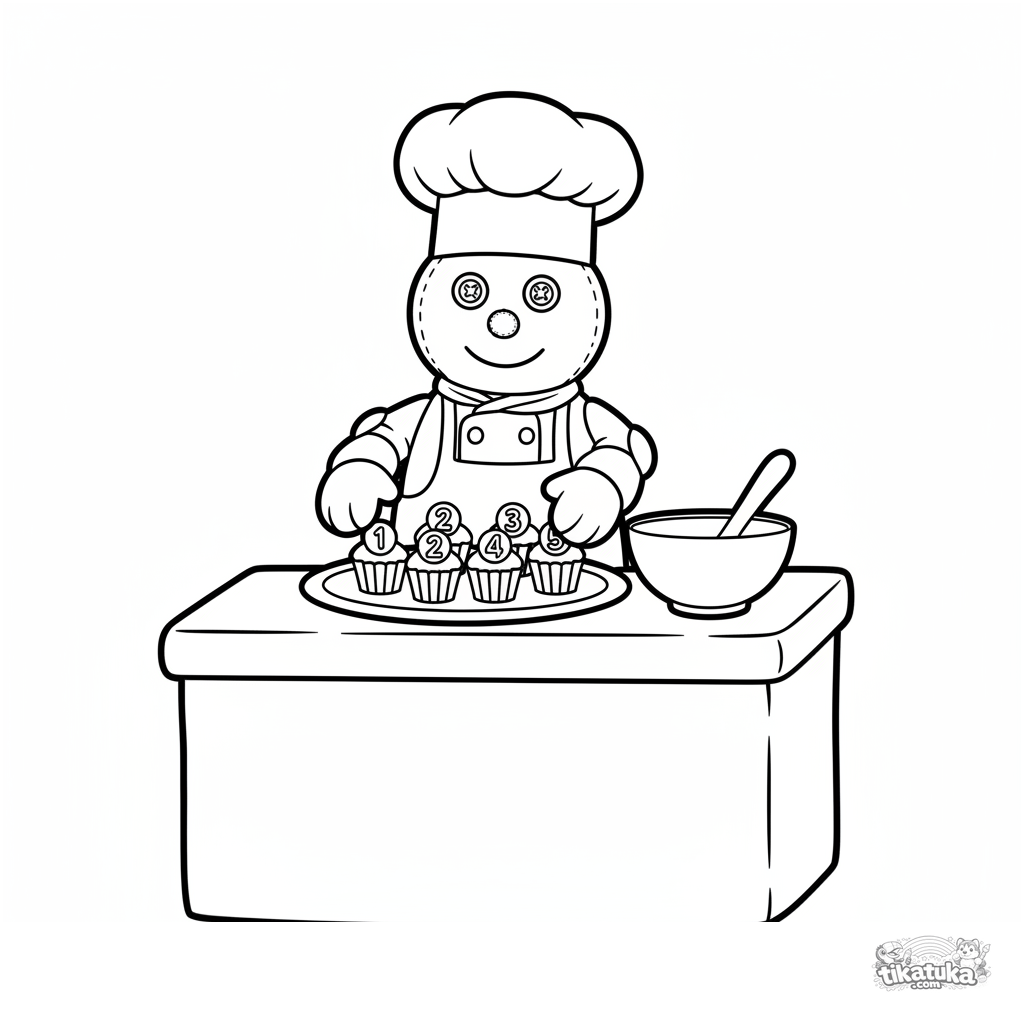 Very simple toddler coloring page: a chef puppet arranges cupcakes on a tray in the classroom. Large shapes, minimal details. For kids 2-3 years old.