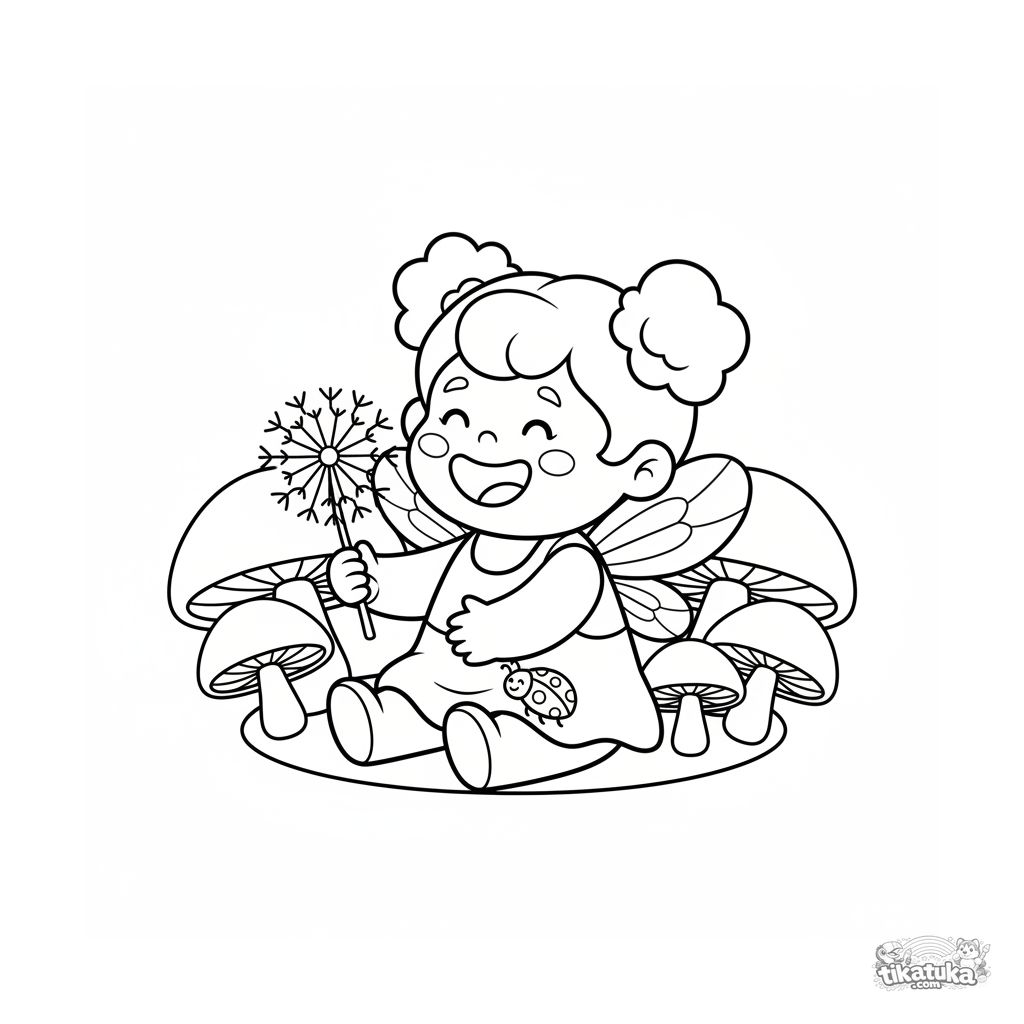Simple coloring page for toddlers 2-3: a smiling fairy princess sits in a ring of large mushrooms in a meadow, holding a dandelion. Large shapes, wide margins.