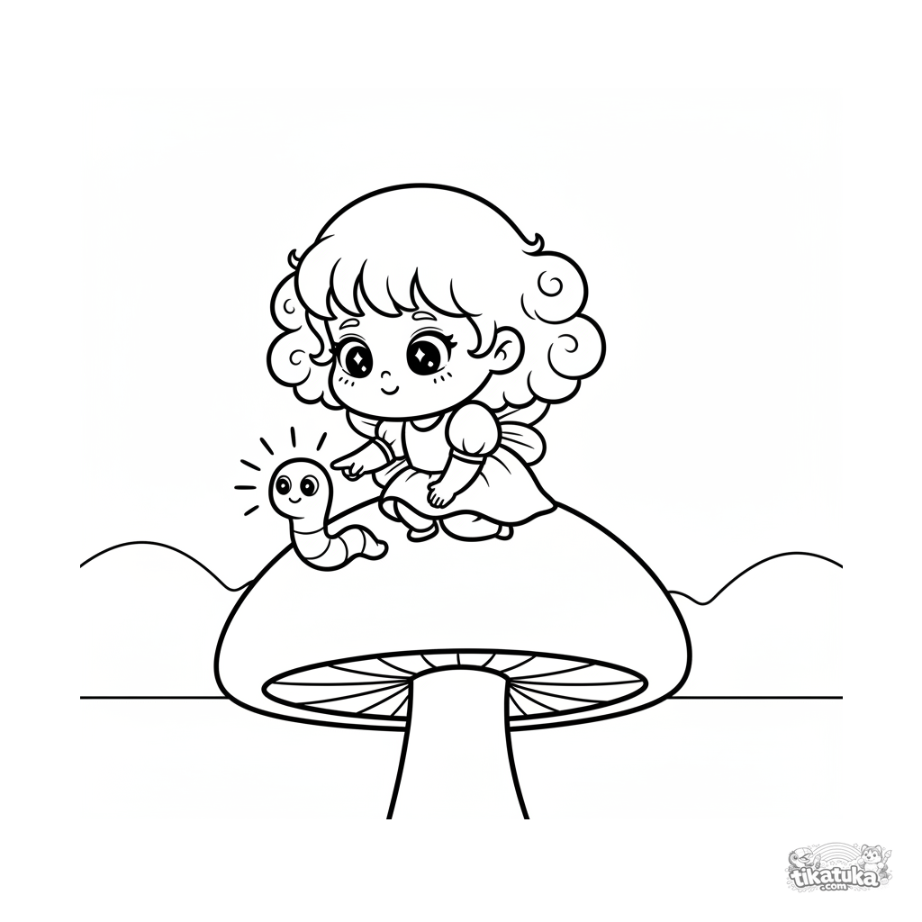 Simple coloring page for toddlers 2-3: a little fairy princess on a mushroom meeting a glow worm. Large shapes and wide margins.