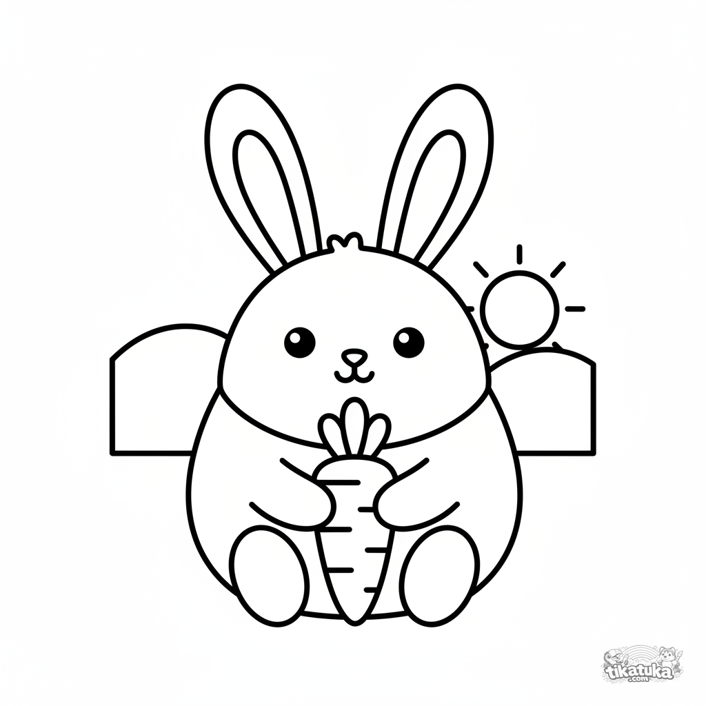 Coloring page for toddlers 2-3 years old: a large round bunny holds a carrot. Simple large shapes, thick outlines, perfect for first painting experiences. Paint by numbers coloring page for kids.