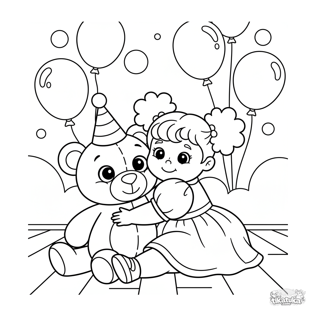 Simple coloring page for toddlers 2-3 years: a girl hugs a giant stuffed bear in a party hall. Large shapes, wide margins for first coloring experience.