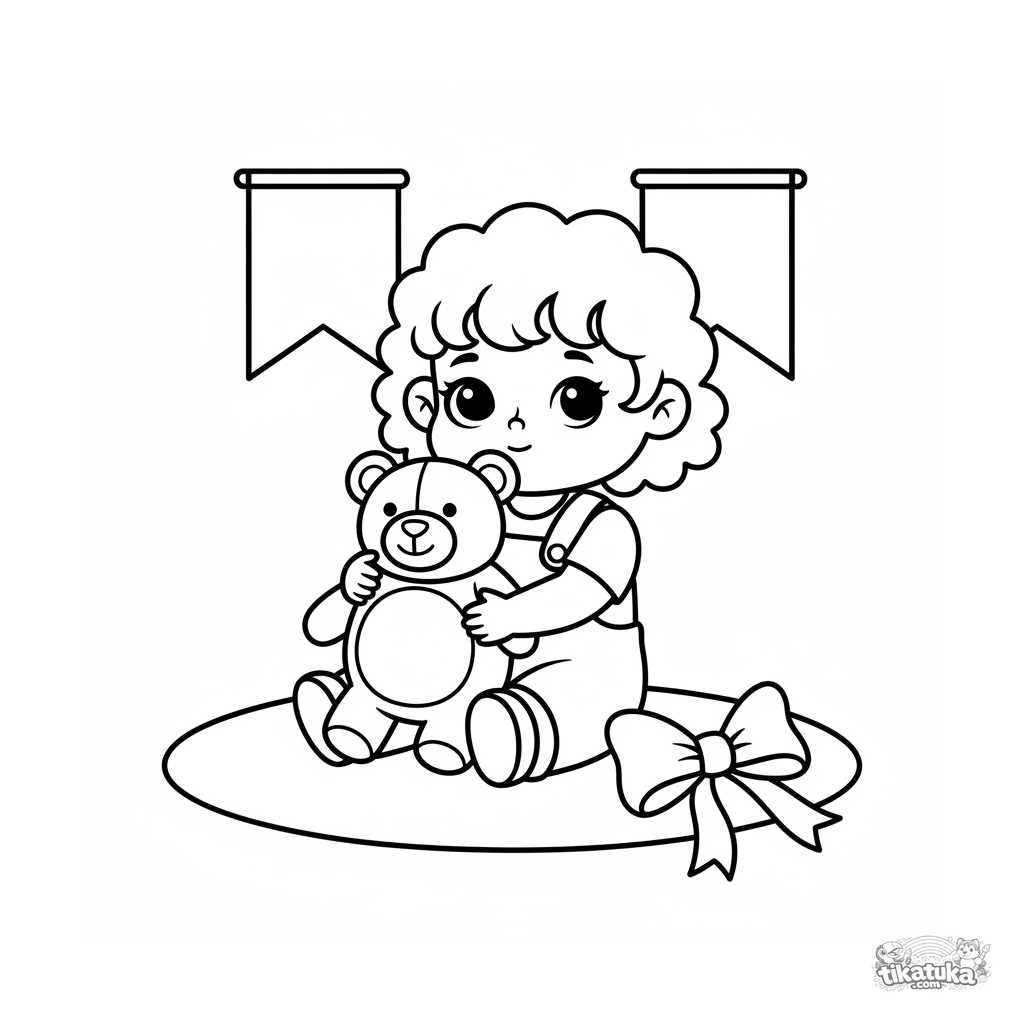 Simple coloring page for toddlers 2-3: a little girl hugging a large plush toy in a festive hall. Large shapes, wide margins.