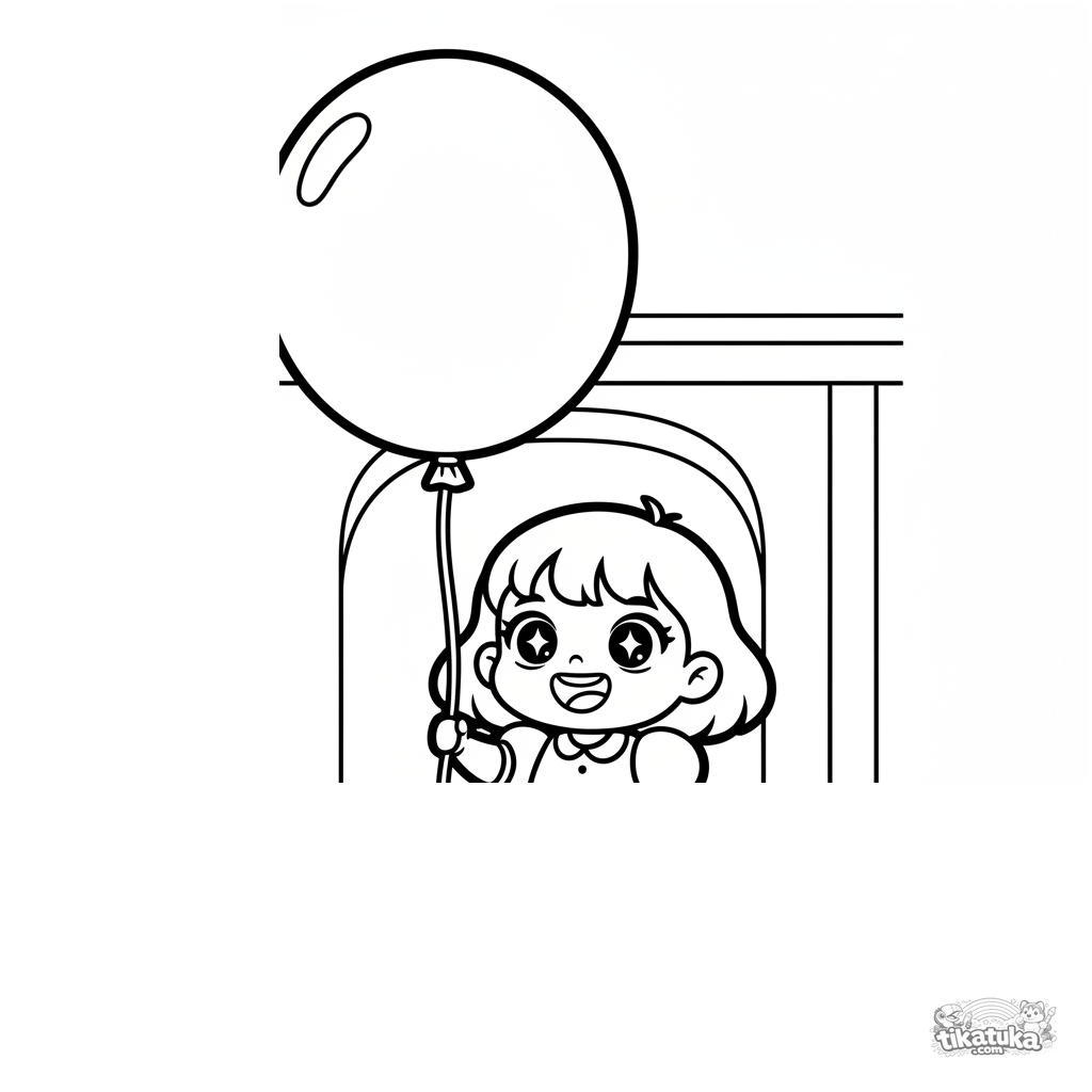 Simple coloring page for toddlers 2-3: a little girl with a giant balloon in a festive hall. Large clear shapes, few details.