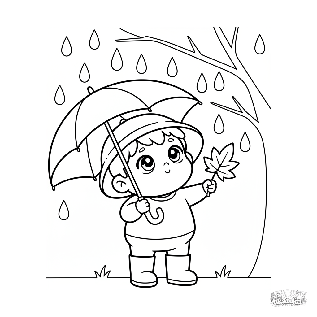 Simple coloring page for toddlers 2-3: a child in boots and rain gear stands with an umbrella, watching drips from a tree in autumn rain.