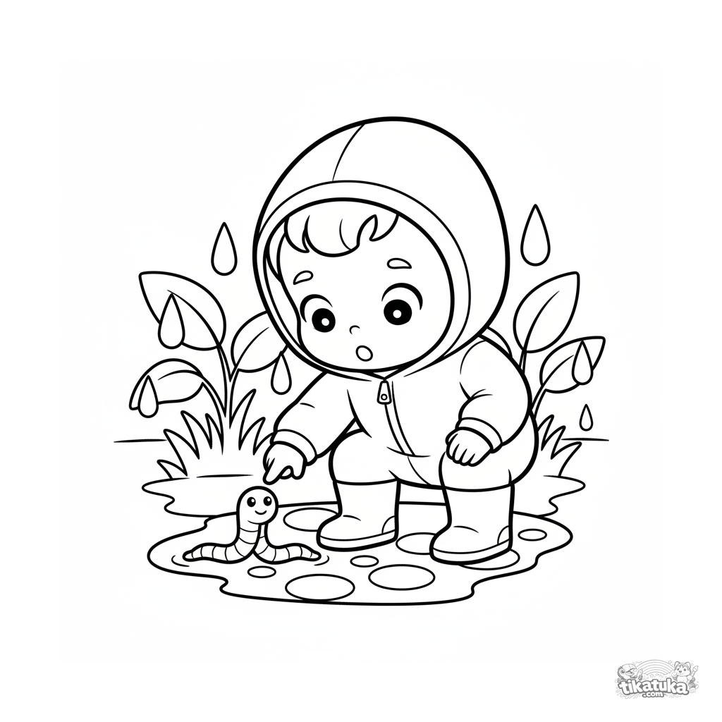 Coloring page for toddlers 2-3 years old: a curious toddler in rubber boots inspects a worm on a wet path after autumn rain. Large simple shapes.