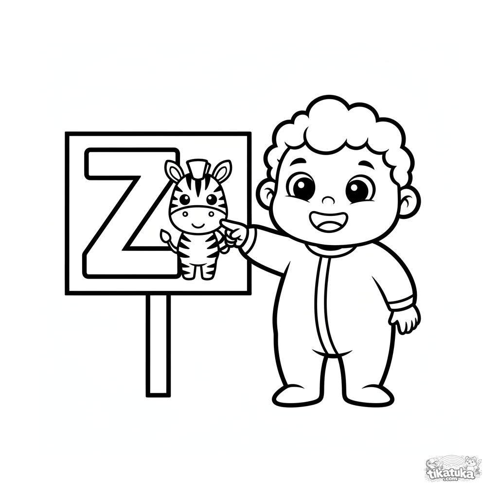 Coloring page for toddlers 2-3: a child pointing at a big letter Z and zebra on a zoo sign. Huge simple shapes, first introduction to the alphabet.