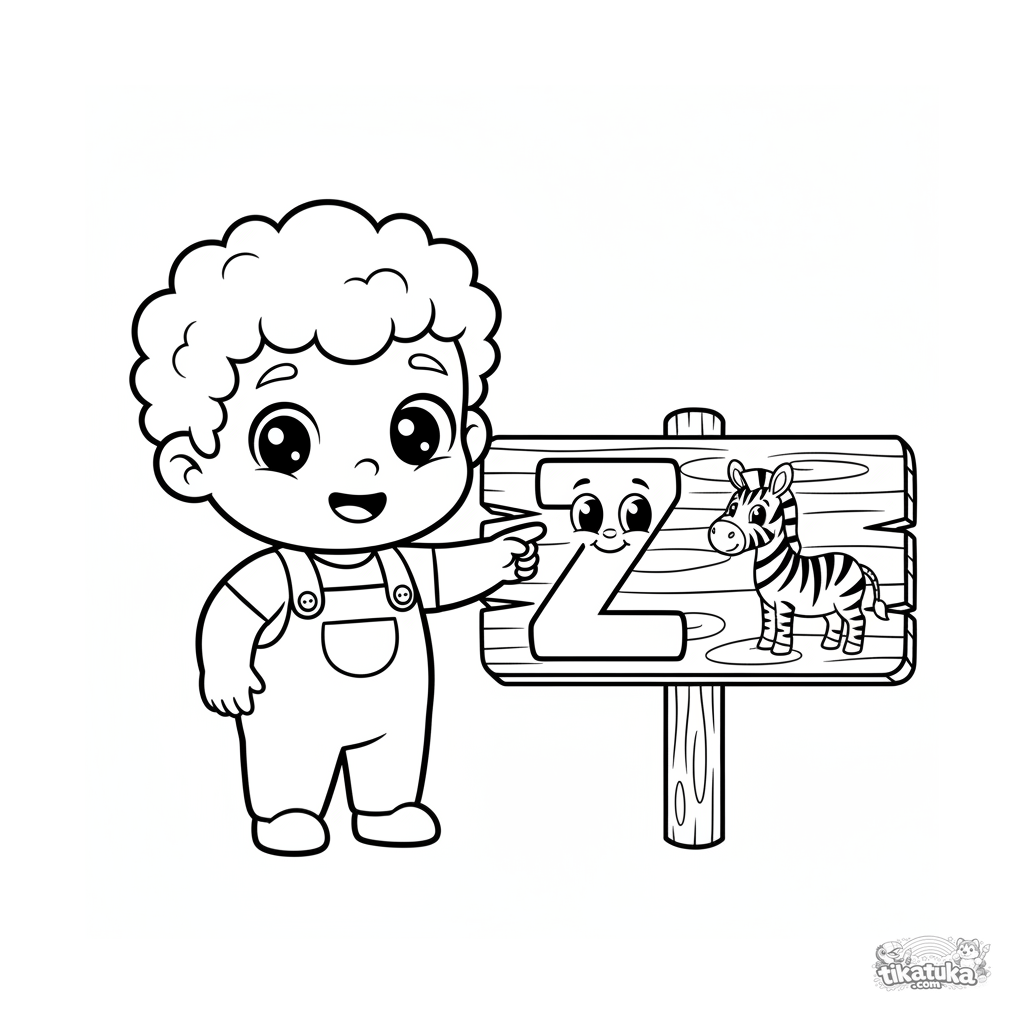 Coloring page for toddlers aged 2-3. A happy toddler points at a big letter Z next to a zebra picture on a zoo sign. Huge simple shapes for first coloring.