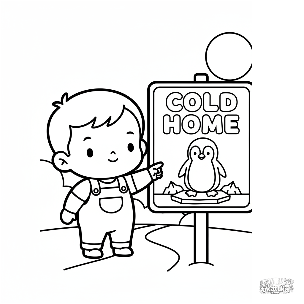 Simple coloring page for toddlers 2-3: a child points at a big penguin habitat sign. Huge margins, large shapes, minimal details for first pencils.