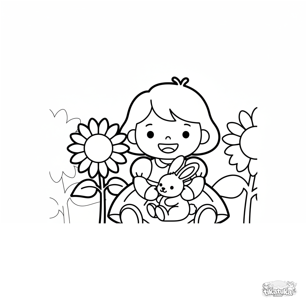 Simple coloring page for toddlers 2-3: a little princess sits in a sunflower field petting a fluffy bunny. Large shapes, wide margins.