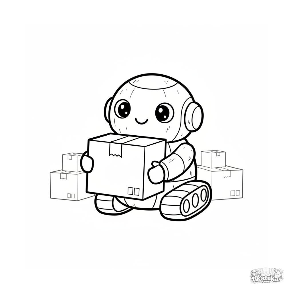 Very simple coloring page for toddlers 2-3: a round, smiling robot on treads carries one huge box in a warehouse. Huge margins, thick outlines, easy to color.
