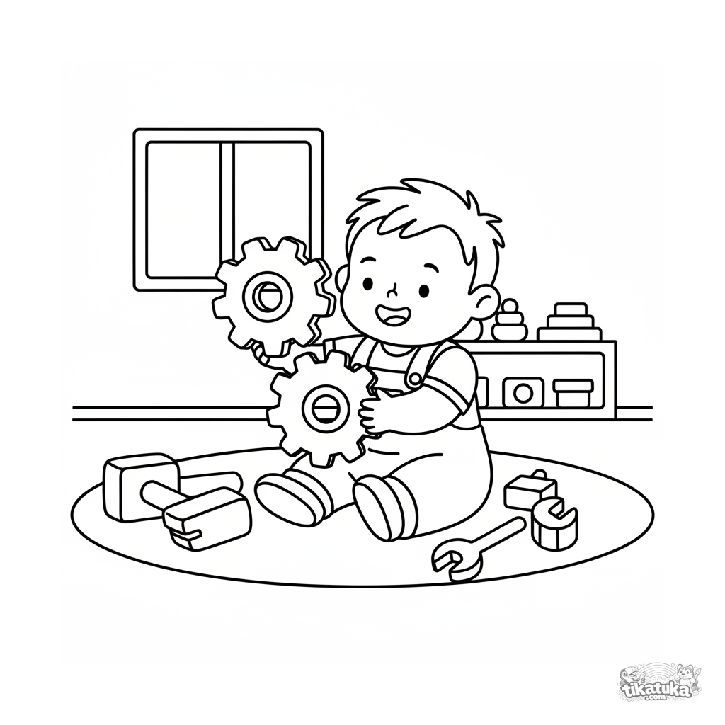 Very simple coloring page for toddlers 2-3: a child stacks giant gears in the lab's play area. Large shapes, minimal detail.