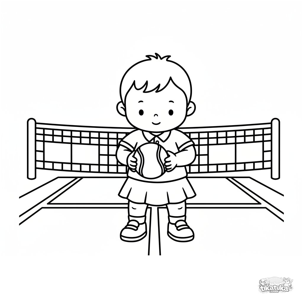 Coloring page for toddlers 2-3 years: a cheerful child on a tennis court learning to bounce a large ball. Simple shapes and wide margins are perfect for first pencils.