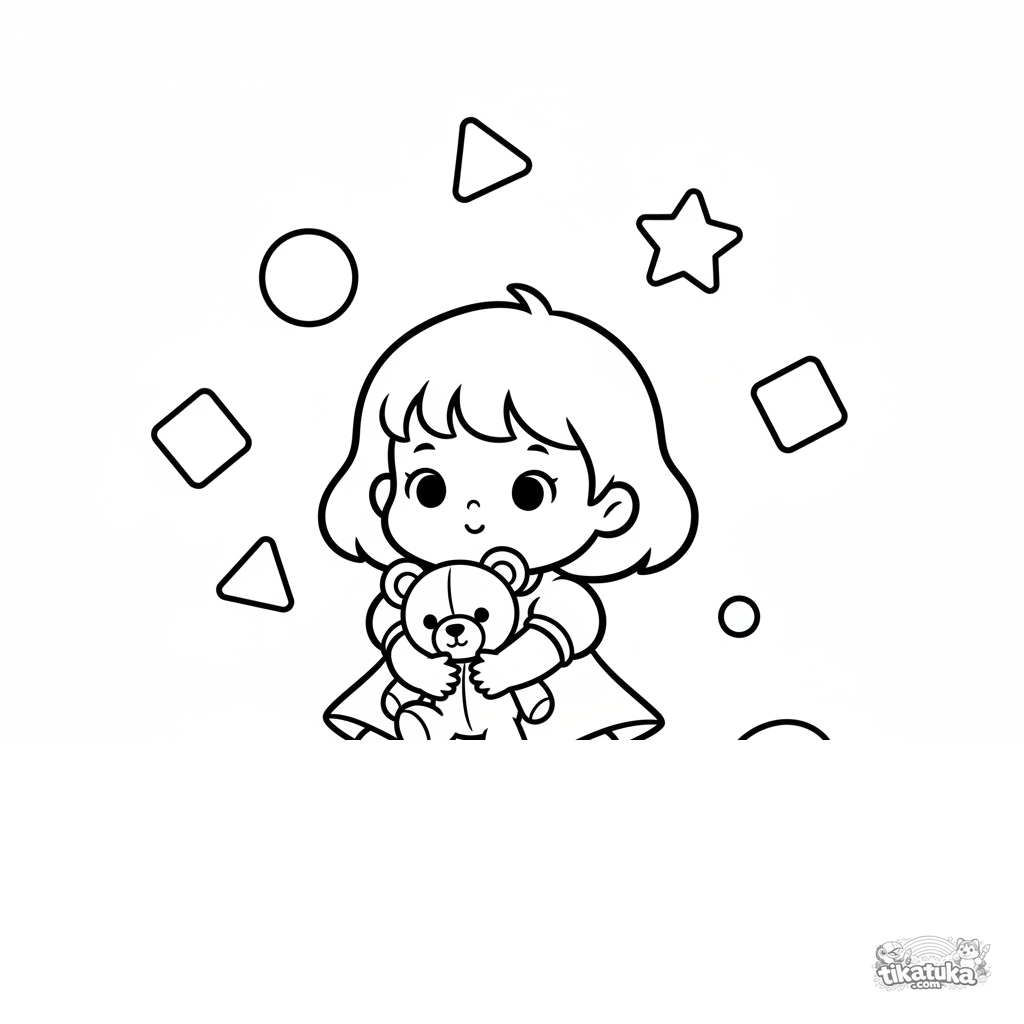 Simple coloring page for toddlers 2-3: a little girl with a teddy bear sits in a festive hall watching confetti fall. Large shapes, wide margins.