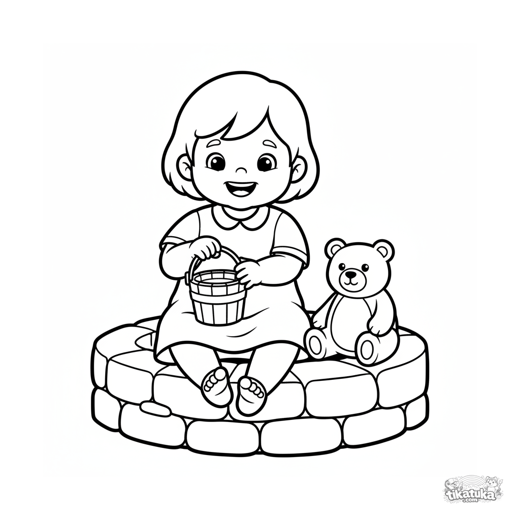 Very simple coloring page for toddlers 2-3: a child sits by the well with a toy bucket. Large shapes, few details, wide margins for coloring.