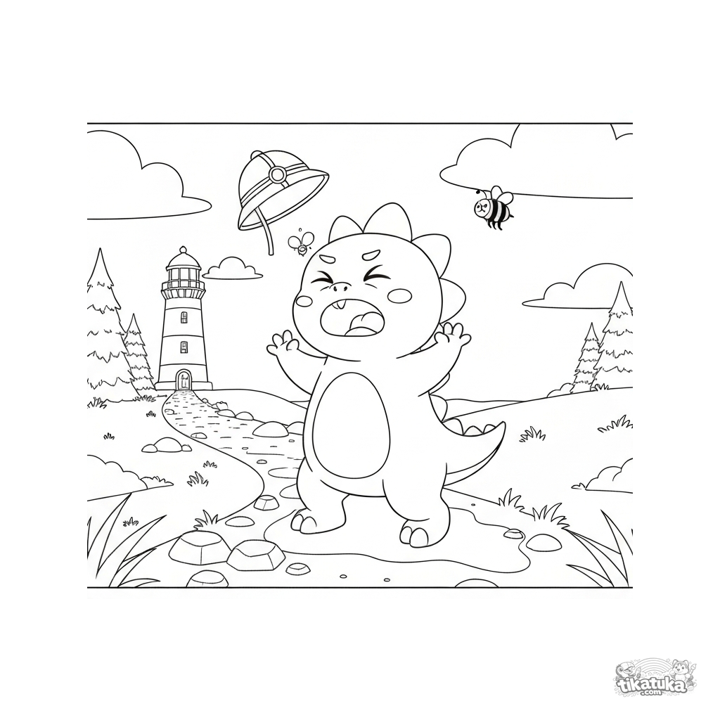 The Big Sneeze: Tosha the dino is mid-sneeze on a path to a lighthouse, startling a bee! Download, print, or color online.