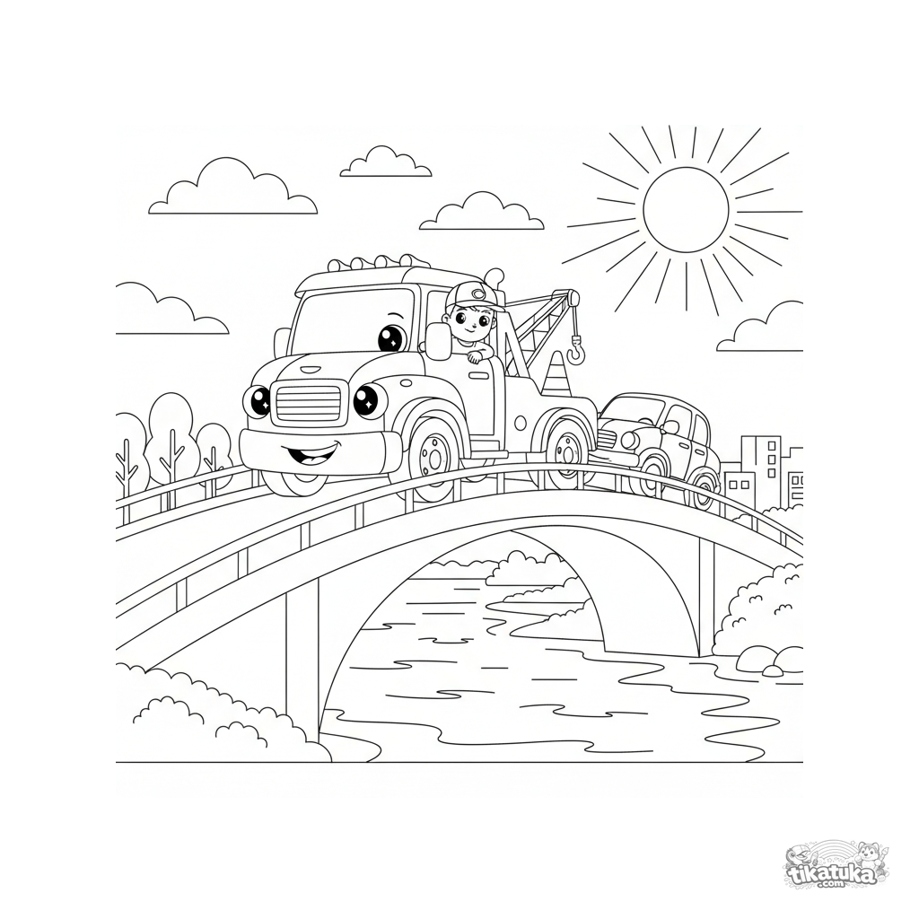 Coloring page for kids 4-6: a friendly tow truck pulls a broken car across a bridge over a large river. Simple shapes and clear scene for young artists.