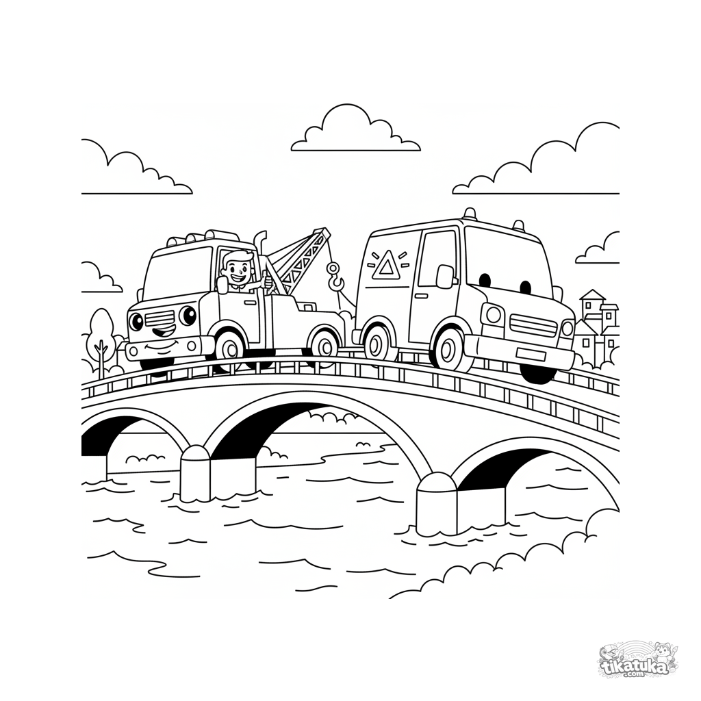 Coloring page for kids 4-6: a friendly tow truck rescuing a broken-down van on a bridge over a river. Simple, fun vehicle scene to color.